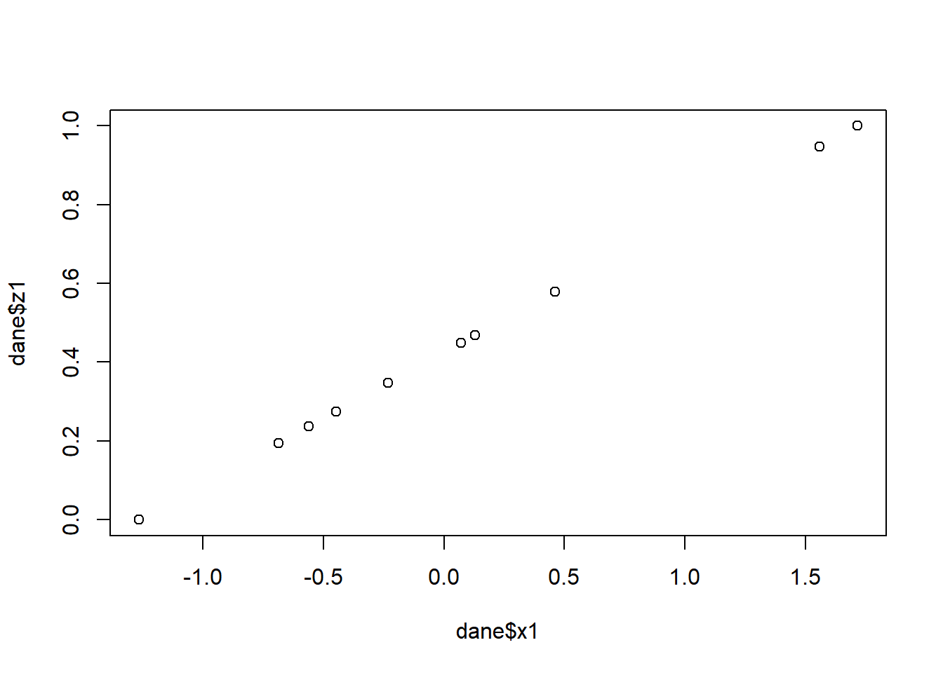 # Zastosowanie funkcji normalize dla każdej kolumnydane$z1 <-normalize(dane$x1)dane$z2 <-normalize(dane$x2)dane$z3 <-normalize(dane$x3)dane$z4 <-normalize(dane$x4)# Wizualizacja efektu normalizacjiplot(dane$x1, dane$z1)